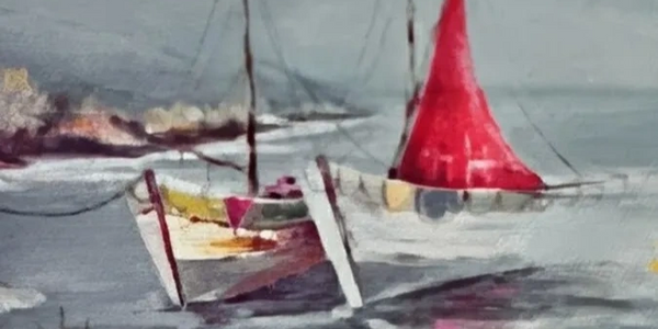 Two small boats rest quietly along the shore, their hulls touching the sand as gentle waves shimmer around them. A single red sail catches the light, glowing like a warm ember and giving the whole scene a sense of calm, almost spiritual radiance.