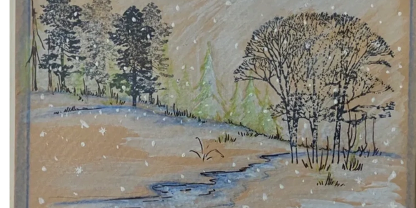 Soft winter trees stand along a quiet hillside, their branches etched against the pale sky. A gentle pink glow settles across the snow, turning the cold landscape into something warm, peaceful, and almost otherworldly.
